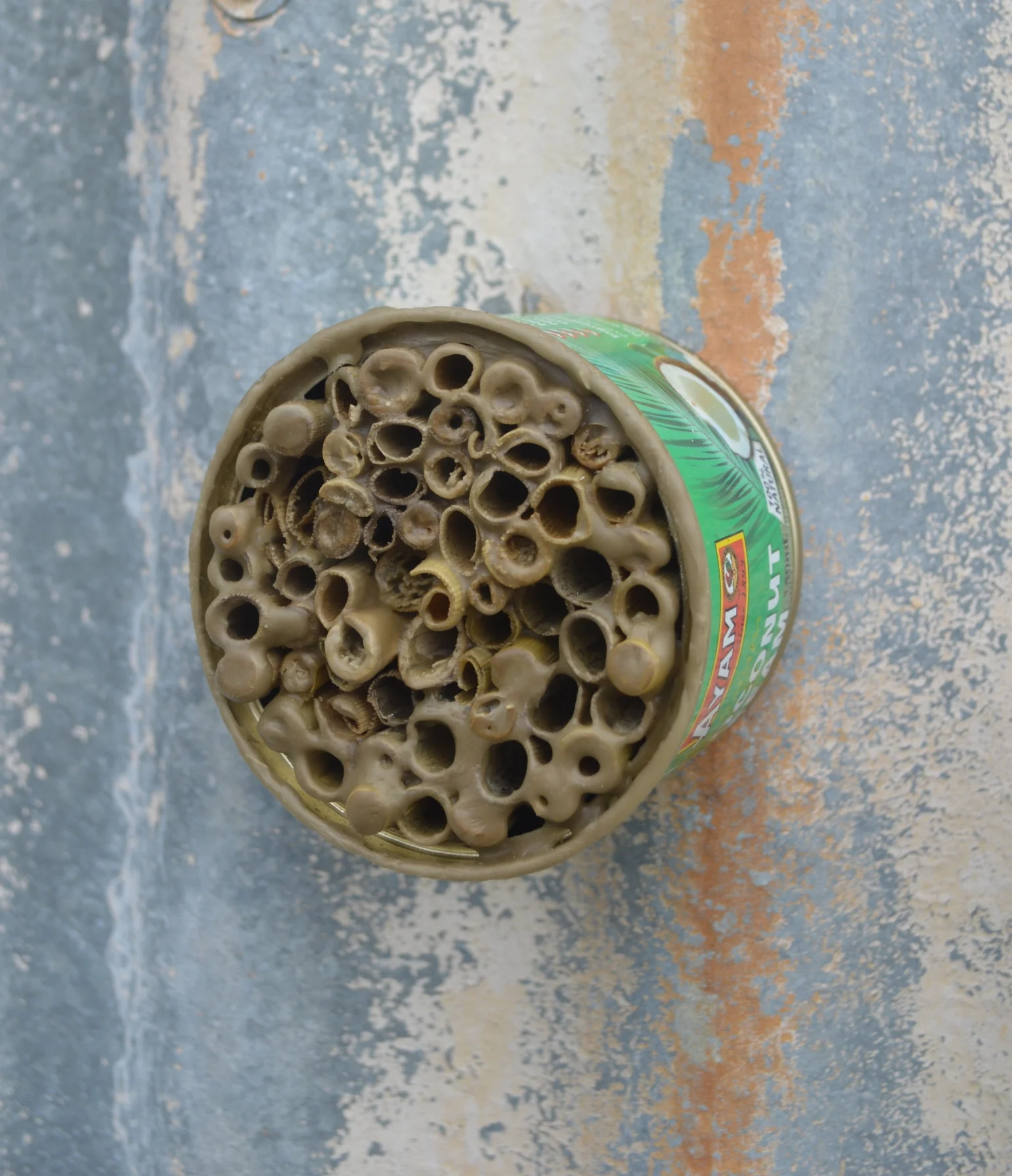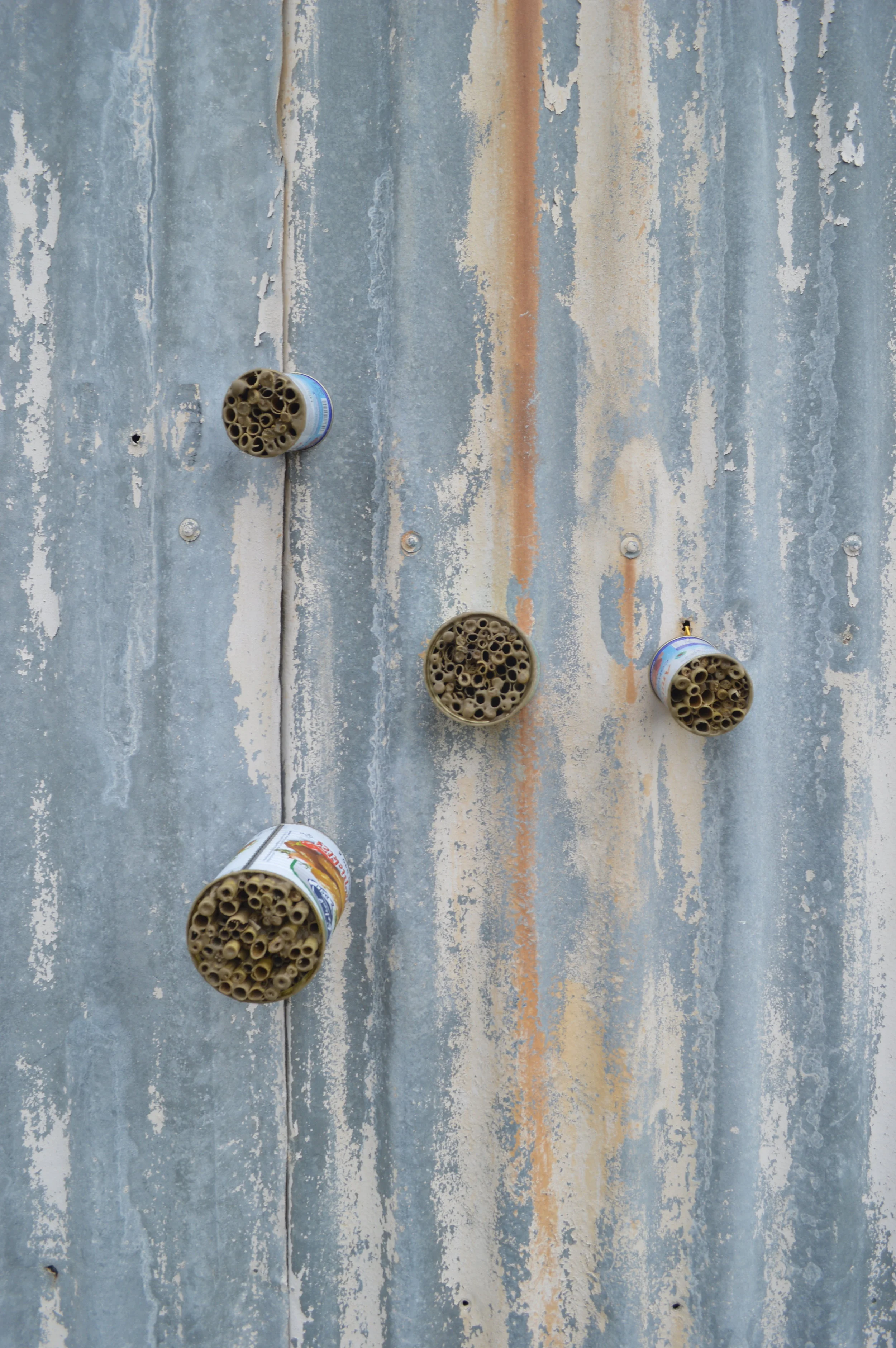 These bee hotels made from repurposed food tins, beeswax and pampas stalks provide somewhere for pollinators to live nest and rear their young.